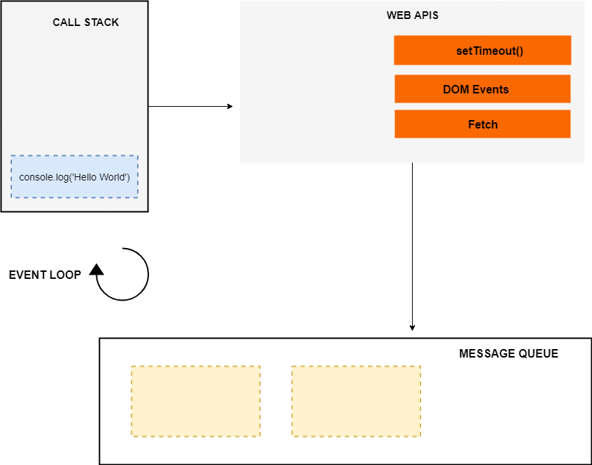 이벤트 루프, web APIs 그리고 메세지 큐/태스크 큐는 자바스크립트 엔진의 일부가 아니고, 브라우저의 자바스크립트 런타임 환경 또는 Node.js 자바스크립트 런타임 환경의 일부입니다. Node.js에서는 web APIs가 C/C+ APIs로 대체됩니다.